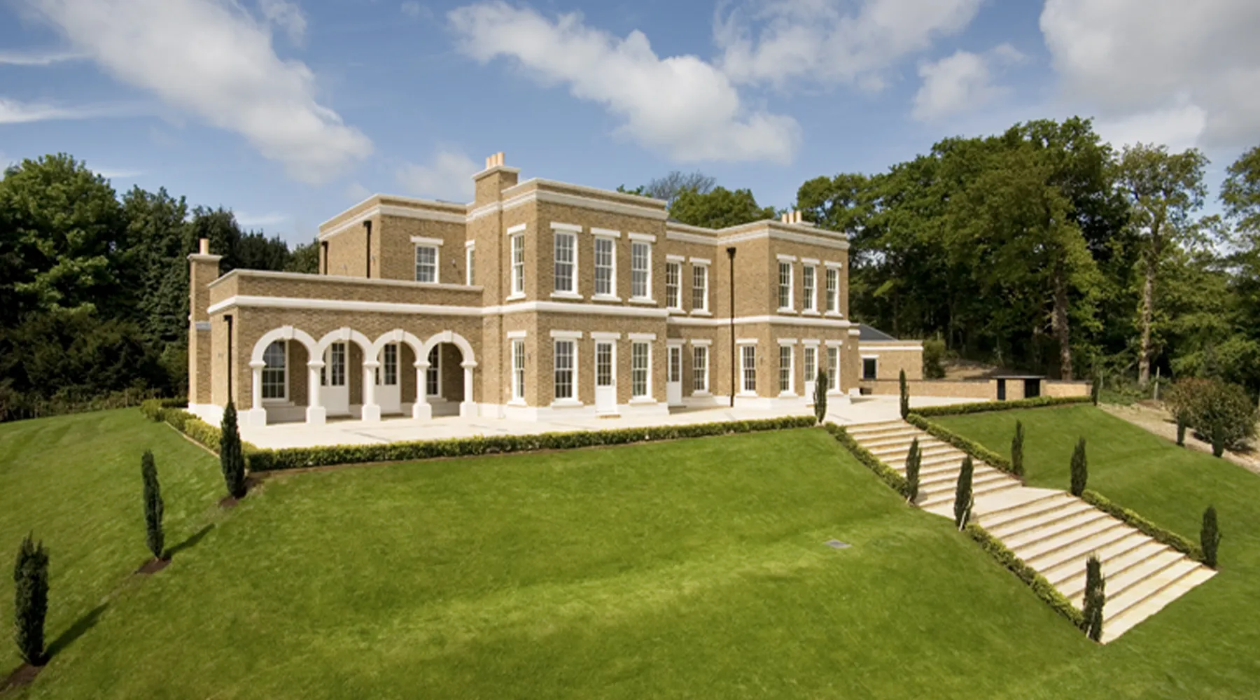 The grounds feature raised terraces for outdoor entertaining, formal lawns, orchard and tennis court.