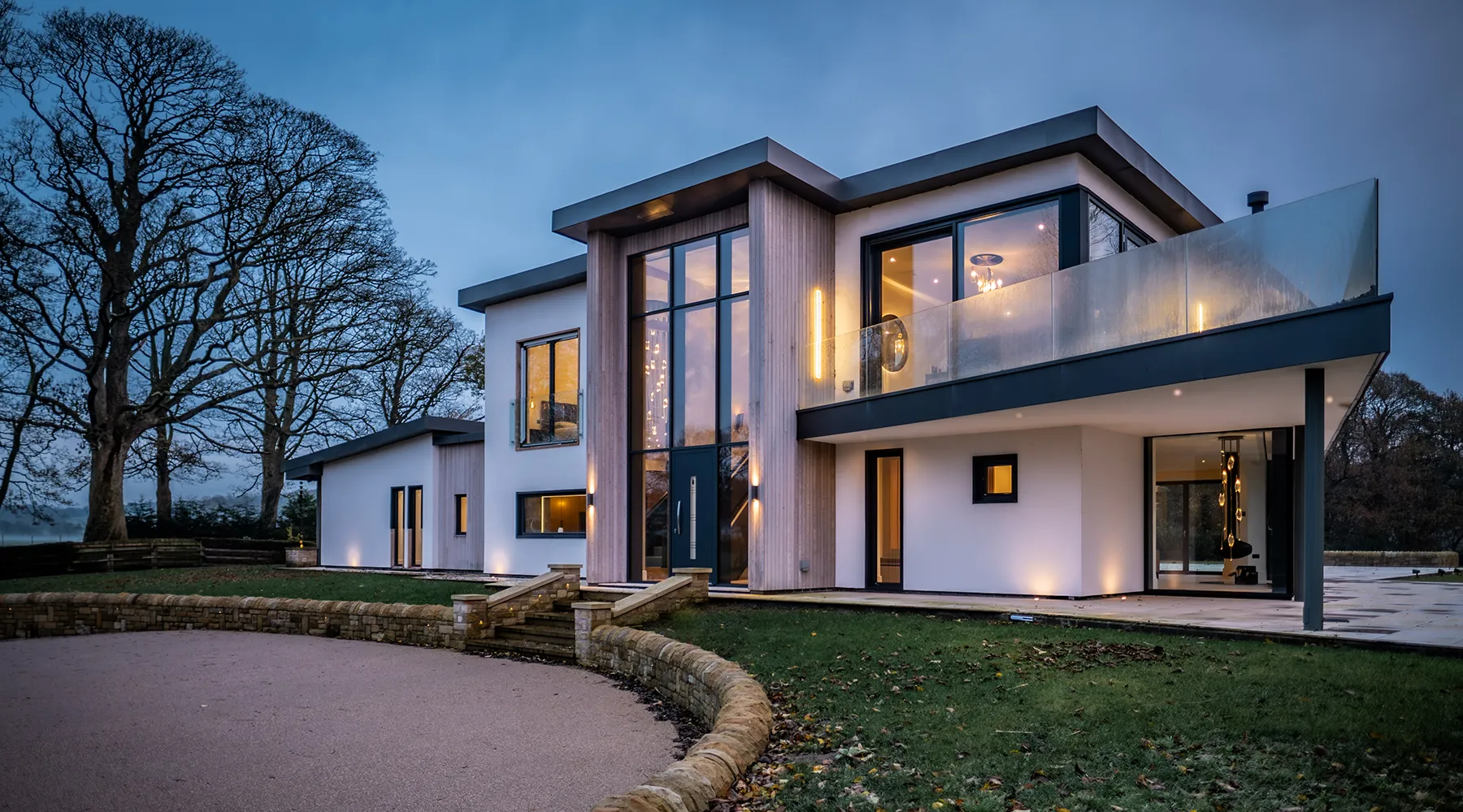 In the double-height entrance and across the rear elevation, bespoke exterior lighting highlights render, stonework and weathered larch cladding. As dusk settles, the property emits a warm, architectural glow; refined, never overpowering.